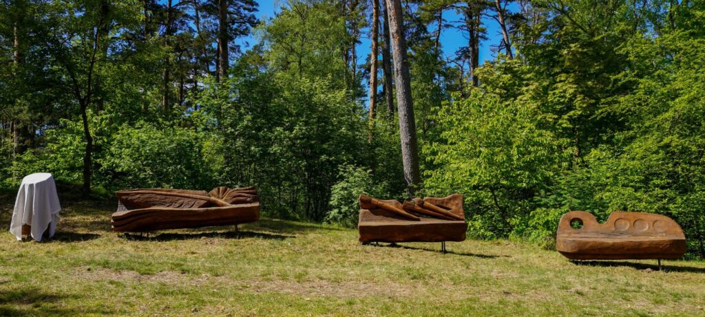 Нида, 29.05.2022. В Ниде на Куршской косе был открыт памятник в память о более раннем памятнике. До 1930-х годов здесь располагалась колония художников Нидден. Художники и литераторы из других мест, а также студенты и преподаватели Кёнигсбергской художественной академии приезжали сюда, чтобы обрести художественное творчество в спокойствии природы. В 1925 году Эрнст Молленхауэр создал мемориал для трех художников, погибших в Первой мировой войне. Среди них был очень успешный поэт Куршской косы и сын еврейской семьи из Кёнигсберга, Вальтер Хейманн. Этот памятник, также посвященный еврею, был разрушен последователями национал-социалистической идеологии в 1939 году. В 2022 году на холме перед домом отдыха «Каститис» в Ниде была торжественно открыта табличка в форме старого памятника и три резные деревянные скамейки для двух художников и поэта.